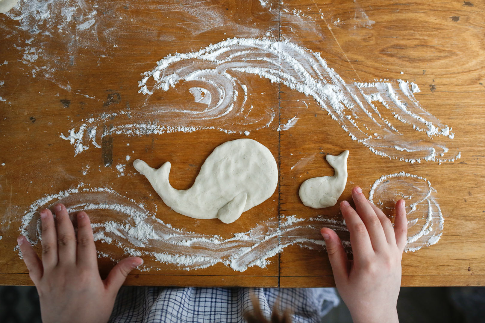 Girl child sculpts from dough, creativity with salt dough. child bakes cookies, help mom, kid cook. Authentic lifestyle in a real interior